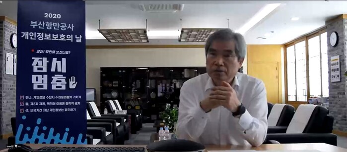 ▲ 6일 부산항만공사 개인정보 보호의 날을 맞아 비대면 회의를 주재하고 있는 남기찬 사장 [사진= 부산항만공사] |