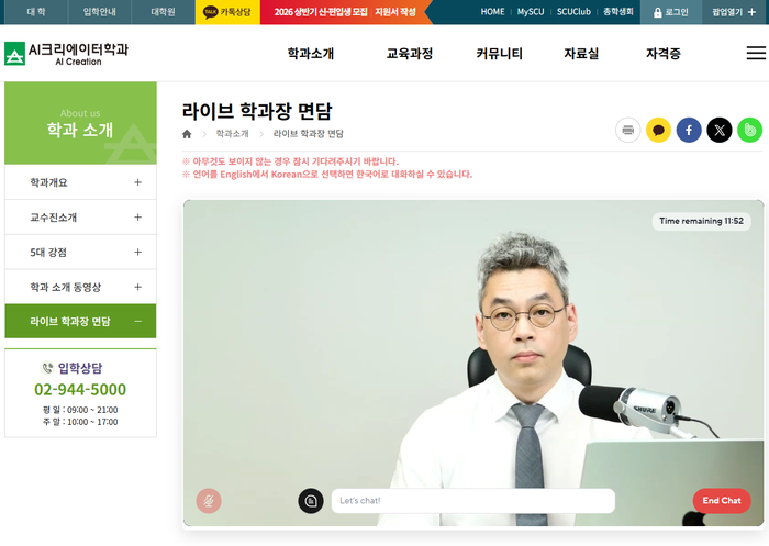 놀라운 싱크로율을 자랑하는 김환 학과장의 AI 버추얼 라이브 면담은 서울사이버대 AI크리에이터학과 홈페이지에서 누구나 체험해 볼 수 있다.