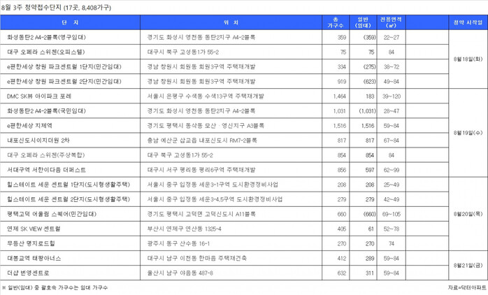 [메가경제=임준혁 기자] 8월 셋째 주(17~23일) 전국의 아파트 청약 물량은 17곳, 8408가구다. 견본주택은 10곳이 문을 열 예정이다. 당첨자 발표는 22곳, 당첨자 계약은 16곳이다.