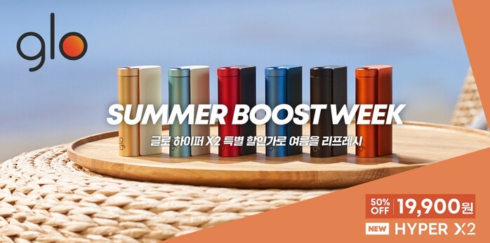 이번 프로모션은 글로 하이퍼 X2의 신규 컬러 ‘메탈 블루’ 출시를 기념하기 위해 선보인 여름 캠페인의 일환으로, 팝업스토어 및 각종 SNS 이벤트 등 다채로운 행사와 함께 진행된다. ‘썸머 부스트 위크’는 글로 공식 웹사이트 디스커버글로(discoverglo.co.kr)와 카카오, 네이버, 쿠팡 등의 오픈 마켓을 포함하여 전국 편의점 등 다양한 구입처에서 진행된다. 한정 수량으로 실시되는 만큼 프로모션은 조기 종료될 수 있다.