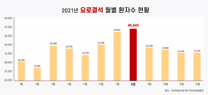 결석은 기온이 높은 여름철에 환자가 가장 많다. 건강보험심사평가원 국민관심질병통계의 2021년 월별 요로결석증 진료 인원을 보면, 8월에 46,645명으로 연중 환자 수가 가장 많았다.