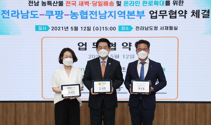 쿠팡은 전라남도, 농협중앙회 전남지역본부와 ‘지역 우수 농특산품 온라인 판로 확대와 소비촉진을 위한 업무협약(MOU)’을 체결했다고 12일 밝혔다.