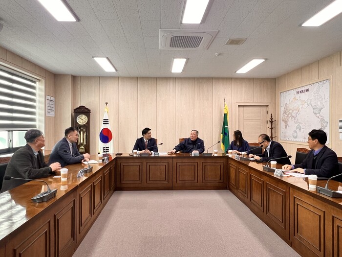 | ▲ 한서대학교 함기선 총장과 몽골민간항공청 투르바야르 청장 외 글로컬대학 기반 항공교육 협렵 논의 |