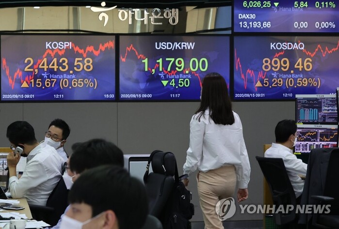 ▲ 코스피가 연고점을 경신한 15일 서울 중구 을지로 하나은행 딜링룸에서 딜러들이 업무를 보고 있다.[서울= 연합뉴스] |