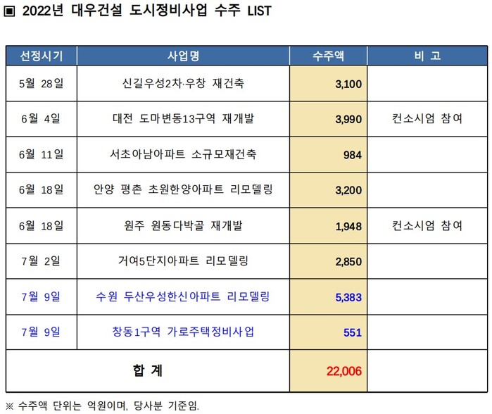 | ▲ 2022년 대우건설 도시정비사업 수주 리스트 [대우건설 제공] |