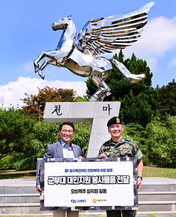 오비맥주는 이날 천마부대를 방문해 군용 가방 등 군 장병들을 위한 위문품과 대민 지원 활동에 사용하는 조경용 전기톱, 잔디깎기 등 1000만원 상당의 물품을 전달했다.