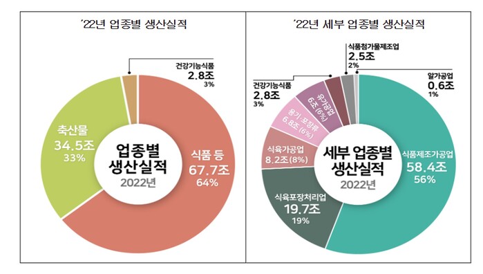 식품의약품안전처와 식품안전정보원은 27일 2022년 국내 식품산업 생산실적을 이같이 공개하며 "최근 5년(2017~2021년) 연평균 증가율 5.5%와 비교해 약 7.2%p(포인트) 높은 증가율을 기록했다"고 밝혔다.