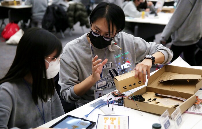 엔씨는 성남 지역 성남중앙초등학교와 대일초등학교의 5~6학년 학생 총 40명을 판교 R&D센터 사옥으로 초청해 지난 19일부터 이틀 동안 엔씨 코드 플레이를 진행했다. 학생들은 ▲코딩 무드등 만들기 ▲게임‧직업 특강 ▲사옥 투어 ▲선물 전달식 등 다양한 행사에 참여했다.