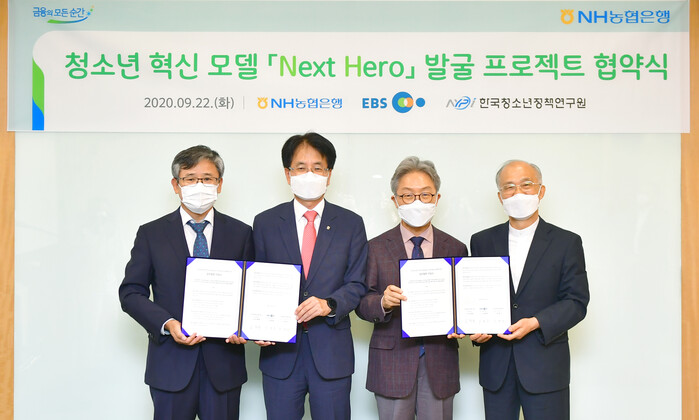 [메가경제= 최낙형 기자] NH농협은행은 22일 NH농협은행 본사에서 EBS·한국청소년정책연구원과 함께 청소년 혁신 모델 '넥스트 히어로(Next Hero)' 발굴을 위한 업무협약식을 개최했다.