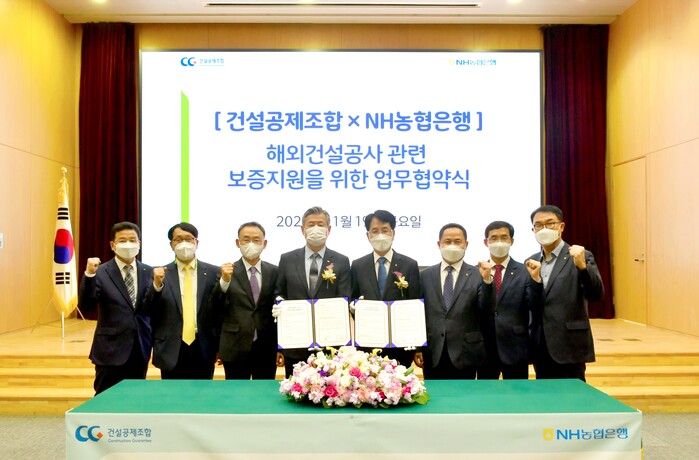 [메가경제=최낙형 기자] NH농협은행은 19일 서울시 중구 농협은행 본점에서 건설공제조합과 국내 건설사 지원을 위한 ‘해외건설공사 관련 보증지원 협약’을 체결하고, 건설공제조합 협약(MOU) 외화표시지급보증서‘ 상품을 출시했다고 밝혔다.