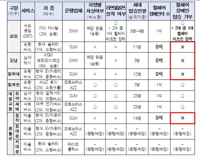 유형별로는 최대 탑승인원 11명의 자율주행 순환버스에는 장애인석이 없으며, 강남 심야택시, 청와대 순환버스(12인승), 동작 마을버스(14인승) 역시 모두 휠체어 이용자가 탑승할 수 없는 구조로 확인됐다.