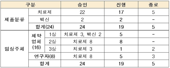 이로써 현재 국내에서 코로나19와 관련해 임상시험이 진행 중인 치료제와 백신은 총 19건(치료제 17건·백신 2건)이다.