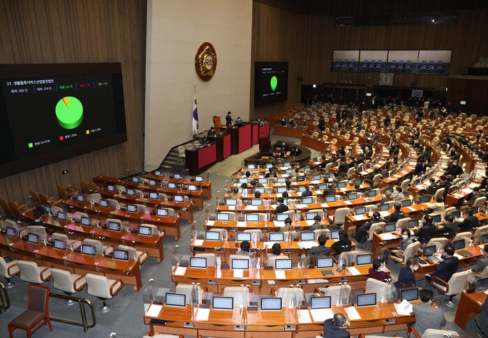 ▲ 8일 오후 서울 여의도 국회에서 본회의에서 생활물류서비스산업발전법안이 가결되고 있다. 이 법은 택배기사 과로사 방지법으로 택배 노동자의 과로를 방지하기 위해 물류 인프라 및 안전 대책을 강화하는 내용을 담고 있다. [사진= 연합뉴스] |