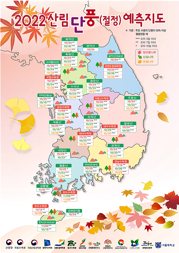 산림청은 본격적인 가을로 들어섬에 따라 산 나들이를 준비하는 국민을 위해 우리나라 주요 산림 지역의 2022년 가을 단풍 절정 시기를 예측한 지도를 발표하면서 이렇게 밝혔다.