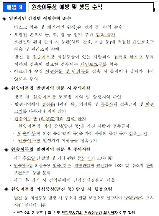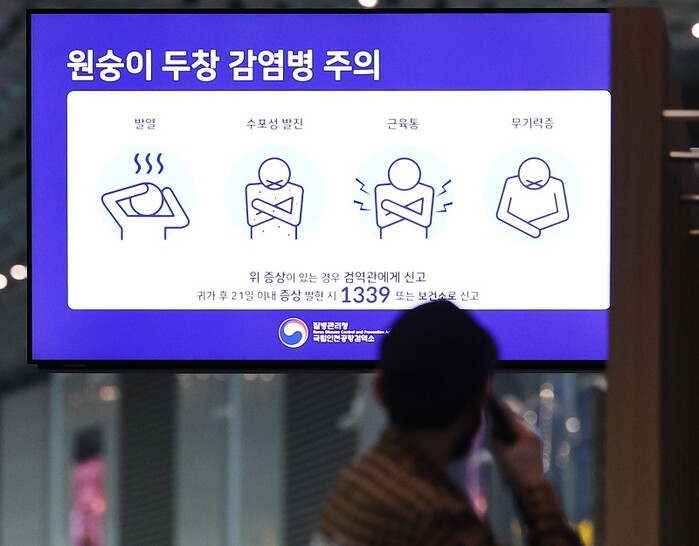 질병청은 또 귀국 후 3주 이내 발열, 오한, 수포성 발진 등 의심 증상이 나타나면 동거인을 포함한 주위 사람들과 접촉하지 않도록 주의해야 하며, 주소지 관할 보건소로 신속히 신고해야 한다고 강조했다.