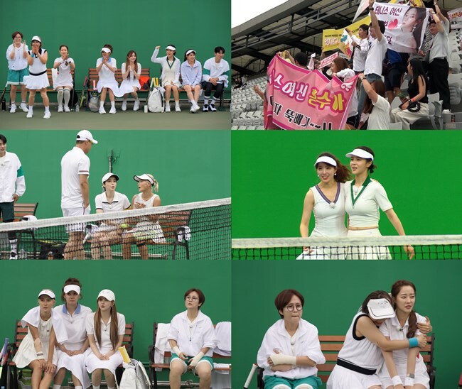 드디어, 황보X홍수아 복식조의 경기를 시작으로 신봉선X고우리, 손성윤X 차해리 복식조의 경기가 차례로 펼쳐진다. 특히 ‘주장’이자 ‘에이스’인 홍수아는 파워 스트로크를 수시로 구사해 관중석을 뜨겁게 달구고, 신봉선x고우리도 환상의 팀워크를 발휘해, “방송에서 보던 것과 다르네”라는 상대팀의 ‘찐 반응’을 자아낸다. 반면 ‘위닝샷’의 에이스인 차해리는 경기 도중 심판의 ‘렛’ 선언에 당황하는 모습을 보여 긴장감을 높인다.