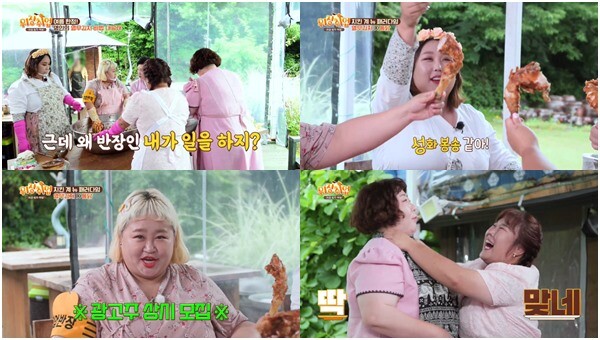 열심히 작업을 마친 4인방은 드디어 푸짐한 저녁 식사를 한다. 한식 명인이 직접 만든 열무김치와 가마솥 통닭 네 마리를 받아 ‘1인 1닭’ 먹방에 돌입하는 것. 모두가 신나게 닭다리 건배를 하는 가운데, 풍자는 "우리 치킨 광고 들어올 것 같아“라고 외쳐 분위기를 더욱 끌어올린다. 그러던 중 신기루는 갑자기, “난 바삭바삭한 껍질을 좋아하는데, 남편이 연애할 때 껍질을 벗긴 뒤 치킨 속살을 발라줬다”라고 과거 연애시절을 떠올린다. 이를 들은 풍자는 “형부가 언니를 많이 사랑했네”라고 부러워하고 ‘홍크박스’ 홍윤화는 곧장 아이콘의 ‘사랑을 했다’를 열창해 대환장 케미를 폭발시킨다.