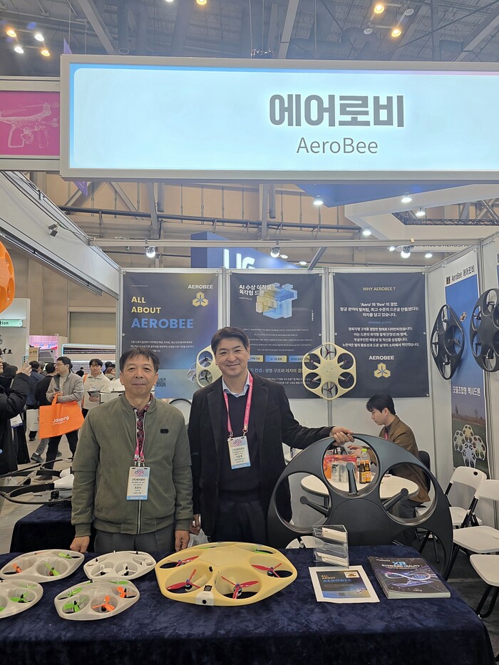 | ▲에어로비의 이문철 대표(사진 우측)가 '2026 드론쇼 코리아'전시 부스에서 포즈를 취하고 있다. |
