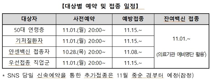 50대 연령층과 18세 이상의 기저질환자 및 우선접종 직업군 중 기본접종 6개월이 경과한 사람은 11월 1일부터 사전예약을 통해 11월 15일부터 추가접종을 받을 수 있다.