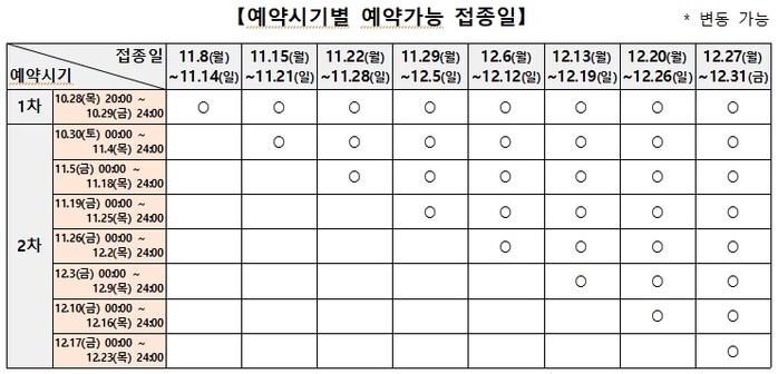 ▲ 예약시기별 예약가능 접종일. [질병관리청 제공] |