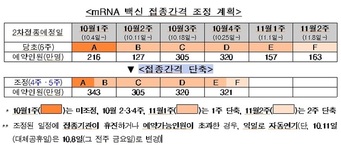 접종간격 단축은 10월 2주(10월 11~17일) 2차접종 예약자들부터 일괄 조정하되, 10월 2주~11월 1주(10월 11일~11월 7일) 2차접종 예정자는 접종 간격을 6주에서 5주로 1주 줄이고, 11월 2주(11월 8~14일) 2차접종 예정자는 6주에서 4주로 2주 단축한다.