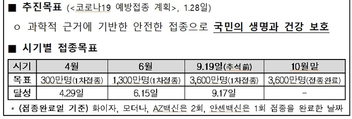 ▲ 코로나19 예방접종 시기별 접종 목표. [코로나19 예방접종대응추진단 제공] |