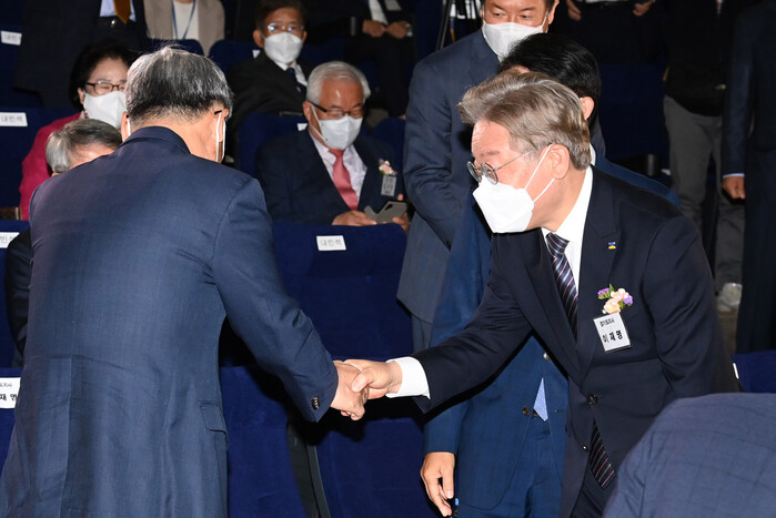 ▲ 이재명 경기지사가 12일 서울 마포구 서울미디어대학원대학교 상암연구센터에서 열린 민주평화광장 출범식에서 참석자들과 인사하고 있다. [국회사진기자단=연합뉴스] |