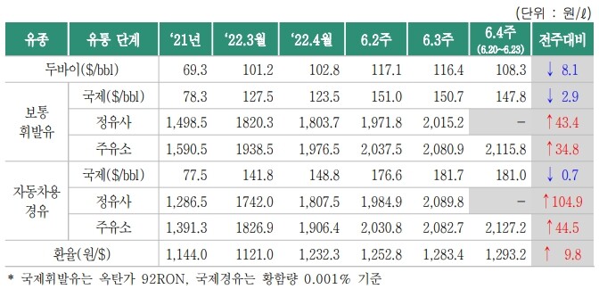 국제 휘발유 평균 가격은 지난주보다 2.9달러 낮아진 배럴당 147.8달러, 국제 자동차용 경유 가격은 0.7달러 내린 배럴당 181.0달러를 각각 나타냈다.