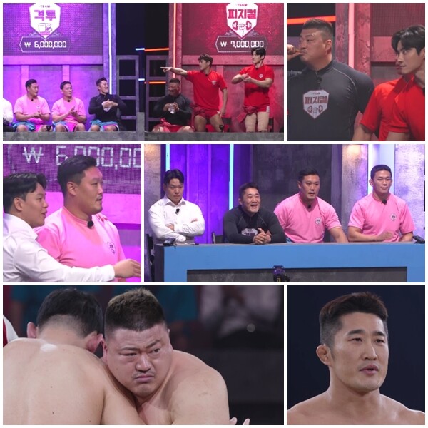 이윽고 양 팀 선수들이 모래판에 입성한 가운데, 격투팀 대장 김동현은 피지컬팀 대장 조진형을 똑바로 쳐다보며 “풍선 근육의 바람을 확 빼버리겠다”고 도발한다. 이에 이미 피지컬팀에게 패배의 ‘찐맛’을 경험해본 농구팀 대장 현주엽은 “거기 풍선 아니다”며 고개를 내젓고, 조진형도 “압도적인 힘이 뭔지 보여드리겠다”며 여유 만만하게 받아친다.