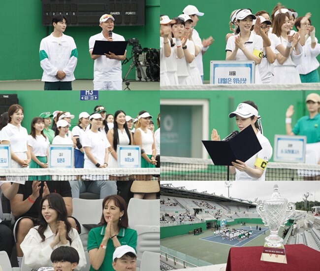 이날 경기 중계에 나선 정용검 해설위원은 “드디어 ‘2023 전국 테니스 동호인 대회’의 날이 밝았다”며, 대회에 참가한 7개의 동호인 팀을 소개한다. ‘열정과다 언니들의 내일은 위닝샷’ 팀을 필두로, 강원의 소크라테니스 팀, 경기 김포 펀펀세꼬시 팀 등 막강한 실력을 보유한 테니스 팀들이 출사표를 던지고, 이중 홍수아는 모든 선수들을 대표해 ‘선수단 선서’에 임한다. 개회사에 맞춰 이형택 감독은 “많은 분들이 지원해 주셔서 감사드린다. 출전한 모든 팀이 부상 없이 건강하게 멋진 경기를 보여주시면 감사하겠다”라고 당부한다.