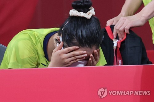 | ▲ 3일 일본 도쿄체육관에서 열린 도쿄올림픽 여자 탁구 단체전 8강 한국 대 독일 경기에서 독일에 역전패해 4강 진출에 실패한 대표팀의 신유빈이 아쉬워하고 있다. [도쿄=연합뉴스] |