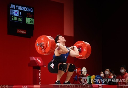 | ▲ 3일 일본 도쿄국제포럼에서 열린 도쿄올림픽 역도 남자 109kg급에 출전한 진윤성이 용상 3차 시기에서 230kg을 들어올리다 실패하고 있다. [도쿄=연합뉴스] |
