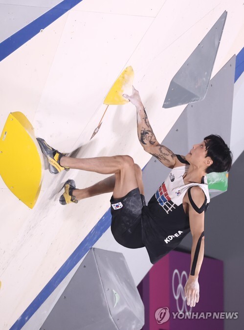 | ▲ 3일 오후 일본 도쿄 아오미 어반 스포츠 파크에서 열린 도쿄올림픽 스포츠클라이밍 남자 콤바인에 출전한 천종원이 볼더링 세 번째 과제를 해결하기 위해 안간힘을 쓰고 있다. [도쿄=연합뉴스] |