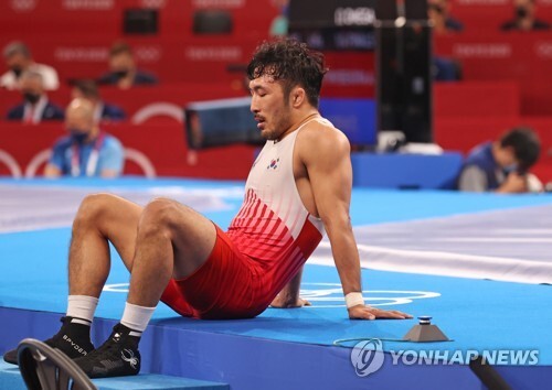 | ▲ 올림픽 레슬링 대표 류한수가 3일 일본 지바 마쿠하리 메세 A홀에서 열린 도쿄올림픽 레슬링 그레코로만형 남자 67kg급 16강전에서 이집트의 무함마드 엘 사예드에 패배한 뒤 자리를 떠나지 못하고 있다. [지바=연합뉴스] |