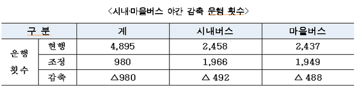 시내버스는 현행 2458회에서 1966회로 492회를, 마을버스는 현행 2437회에서 1949회로 488회를 각각 줄인다.