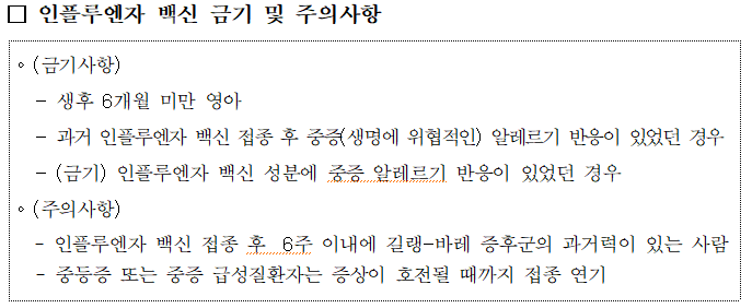 ▲ 인플루엔자 백신 금기 및 주의사항. [출처=질병관리청] |