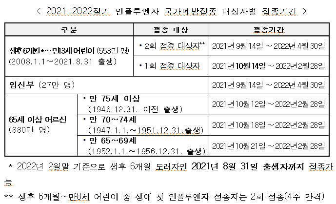 생후 6개월~만 13세(2008.1.1∼2021.8.31 출생) 어린이 553만 명과 임신부 27만명, 만 65세 이상 어르신(1956년 12월 31일 이전 출생) 880만 명이며, 인플루엔자 4가 백신으로 무료접종을 시행한다.