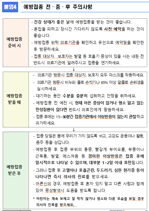 ▲ 예방졉종 전과 중간, 접종 후 주의사항. [출처=질병관리청] |