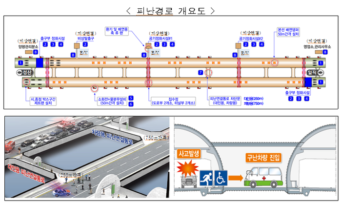 대인용 24개소(250m 간격), 차량용 16개소(750m 간격) 등 총 40개소의 피난통로가 설치됐고, 화재 발생 시에는 진입차량 통제 후 반대편 터널로 신속대피 할 수 있도록 설계됐다.