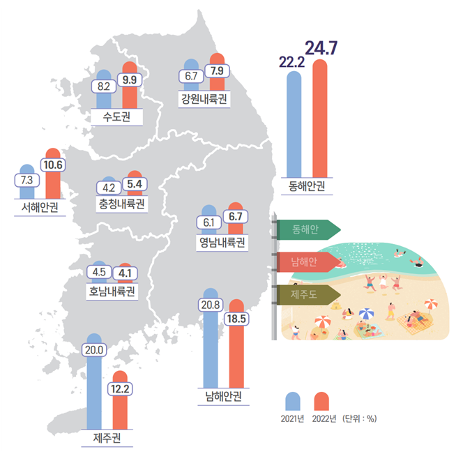 여행 예정지역은 동해안권(24.7%)이 가장 많았고 ‘남해안권’(18.5%), ‘제주권’(12.2%), ‘서해안권’(10.6%), ‘강원내륙권’(7.9%) 순으로 나타났다. 작년에 비해 남해안권, 제주권, 호남내륙권은 줄고, 그 외 권역은 골고루 늘어난 것으로 조사됐다.