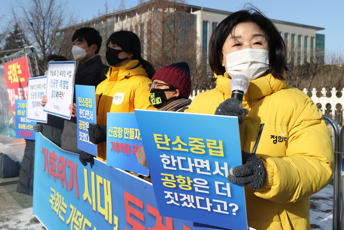 ▲ 정의당 심상정 의원이 17일 오전 서울 여의도 국회 앞에서 열린 '기후위기 가속하는 가덕도신공항 특별법 철회 촉구 기자회견에서 발언하고 있다. [서울= 연합뉴스] |