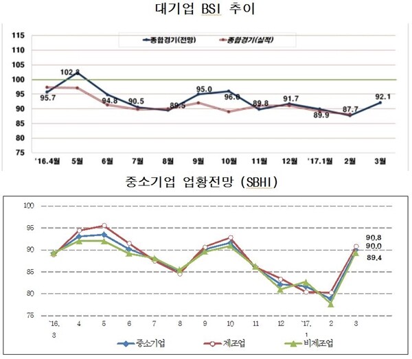 이런 가운데 막상 중소기업과 대기업의 경기전망은 다소 엇갈린다. 중소기업중앙회가 27일 중소기업 3150개를 대상으로 한 '3월 중소기업경기전망조사' 발표를 보면 중소기업 업황전망 건강도지수(SBHI)는 5개월 만에 상승곡선으로 돌아서며 90.0을 기록했다. 긍정적인 신호가 나온 것에 대해 중앙회 측은 "4개월 연속 하락에 따른 기저효과, 건설업 비수기 종료, 본격 사업추진시기 등이 맞물려 기업들이 향후 경기를 긍정적으로 전망했다"고 했지만 기업 경기전망이 긍정보다는 부정이 많은 기준선 100 이하여서 여전히 업황이 부정적일 것이라고 보는 업체가 더 많은 것은 사실이다.