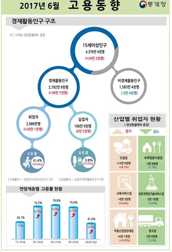 6월 전체 실업률은 3.8%로 전년 동월 대비 0.2%포인트 올랐다. 전체 연령층의 체감 실업률인 고용보조지표3은 0.6%포인트 상승한 11.1%로 집계됐다. 전체 실업자 수는 106만9천명으로 전년 동월 대비 6만5천명 증가했다. 실업자 수는 1월 100만9천명을 기록한 뒤 올해 들어서 6개월 연속 100만명을 웃돌고 있는 것이다.