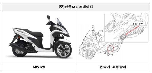 한국모터트레이딩에서 수입해 판매한 야마하 MW125 이륜차 2370대는 변속기 고정장치가 잘못 제작돼 쉽게 풀릴 수 있다.