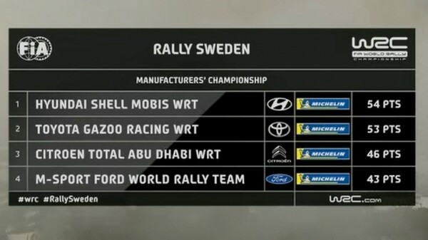 벨기에 출신의 티에리 누빌은 드라이버 순위에서도 총점 41점을 기록해 2위에 10점 앞서며 현대 월드랠리팀의 시즌 최고 성적에 대한 기대감을 높였다.
