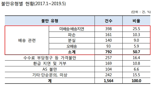 소비자불만 내용을 보면, 배송과 관련된 불만이 50.7%(792건)로 절반을 넘었고, ‘수수료 등 가격불만’이 16.4%(257건), ‘환급지연·거부’ 10.8%(169건)가 그 뒤를 이었다.