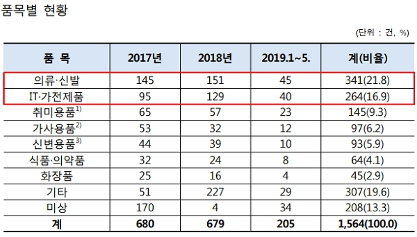 최근 2년 5개월 간 접수된 총 1564건의 소비자 불만 중 품목별로는 ‘의류·신발’이 21.8%(341건)로 가장 많았고, ‘IT·가전제품’ 16.9%(264건), ‘취미용품’ 9.3%(145건) 순이었다.