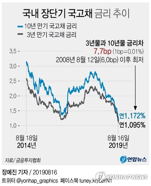 앞서 미국 채권시장에서는 지난 14일(현지시간) 10년물 금리가 장중 한때 연 1.619%까지 하락하면서 2년물 금리(연 1.628%)를 밑도는 역전 현상이 빚어졌다.