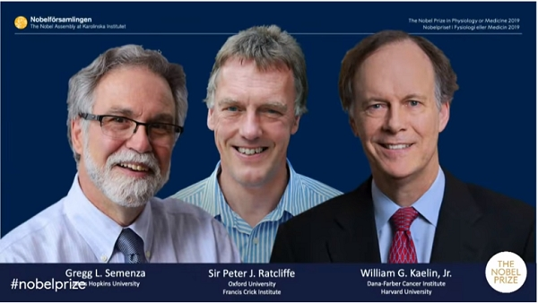 스웨덴 카롤린스카 연구소 노벨위원회는 7일(현지시간) 올해 노벨 생리의학상(The Nobel Prize in Physiology or Medicine 2019)에 세포의 산소 이용 방식을 연구한 미국의 윌리엄 케일린(61)과 그레그 서멘자(63), 영국의 피터 랫클리프(65) 등 3명을 공동수상자로 선정했다고 발표했다.
