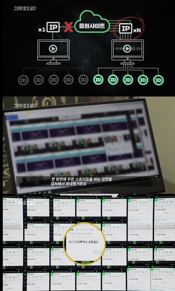 ![4일 밤 방송된 '그것이 알고 싶다'는 음원사재기와 음원조작 의혹과 관련해 집중 추적했다. 그 결과, 한 브로커를 통해 순위를 올리는데 사용하는 방법은 페이스북 등 SNS를 통한 바이럴마케팅이 아니라 불법 거래 또는 해킹을 통해 ID와 IP를 다수 확보한 뒤 음원을 자동으로 반복 재생하는 매크로프로그램을 돌려 음원차트 순위를 조작하고 있다는 충격적인 사실을 전했다. [사진= SBS '그것이 알고 싶다' 방송 캡처]](/news/data/20200104/p179566072990312_408.jpg)